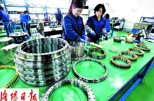 ?。保慈?,在洛陽鴻元軸承科技有限公司,工作人員正在檢驗一批剛下線的精密軸承,準(zhǔn)備發(fā)往外地。