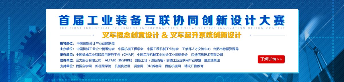 日前,由“中國創(chuàng)新設(shè)計產(chǎn)業(yè)戰(zhàn)略聯(lián)盟”指導(dǎo),中國機(jī)械工業(yè)企業(yè)管理協(xié)會、中國機(jī)械工程學(xué)會、中國工程機(jī)械工業(yè)協(xié)會、工業(yè)和信息化部人才交流中心、合肥市數(shù)據(jù)資源局主辦,中國機(jī)械工業(yè)互聯(lián)應(yīng)用服務(wù)平臺(CMAP),中國工程機(jī)械協(xié)會工業(yè)車輛分會、邁迪信息技術(shù)公司承辦,合力股份有限公司、澳汰爾工程軟件(上海)有限公司、深圳創(chuàng)新奇智科技有限公司、安徽工業(yè)互聯(lián)網(wǎng)產(chǎn)業(yè)聯(lián)盟、愛波瑞集團(tuán)協(xié)辦,機(jī)械狗社區(qū)、精攻開物教育、我的機(jī)械網(wǎng)、我要自學(xué)網(wǎng)、賢集網(wǎng)、新征程學(xué)院、918威客網(wǎng)支持的“全國首屆工業(yè)裝備互聯(lián)協(xié)同創(chuàng)新設(shè)計大賽(叉車專題賽)”報名通道關(guān)閉。