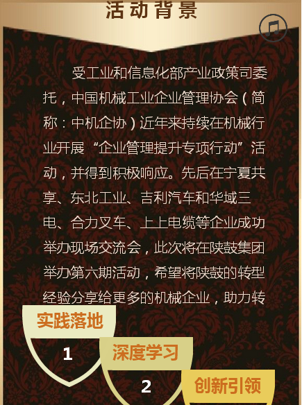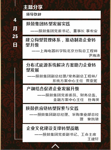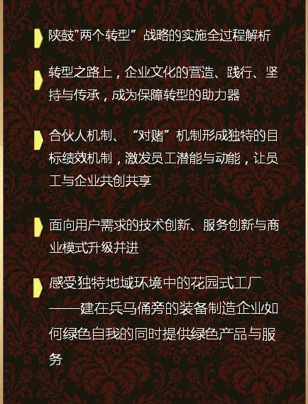 4、活動(dòng)主旨:以“轉(zhuǎn)型變革”為主線,深入分享陜鼓集團(tuán)轉(zhuǎn)型升級(jí)經(jīng)驗(yàn),從轉(zhuǎn)型戰(zhàn)略、解決方案、企業(yè)文化、商業(yè)模式以及供應(yīng)鏈體系等角度,詳細(xì)解析企業(yè)轉(zhuǎn)型變化的全過程。將詳細(xì)介紹陜鼓集團(tuán)獨(dú)特的合伙人機(jī)制、“對(duì)賭”機(jī)制模式下所形成的目標(biāo)績效機(jī)制如何激發(fā)員工潛能與動(dòng)能,讓員工與企業(yè)共創(chuàng)共享;面向用戶需求的技術(shù)創(chuàng)新、服務(wù)創(chuàng)新與商業(yè)模式升級(jí)并進(jìn)的舉措如何落地實(shí)施;感受獨(dú)特地域環(huán)境中的花園式工廠——建在兵馬俑旁的裝備制造企業(yè)如何綠色自我的同時(shí)提供綠色產(chǎn)品與服務(wù)。